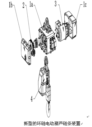 環(huán)鏈電動(dòng)葫蘆主要由減速器,電機(jī)以及鏈條組成,但是由于對(duì)減速器,電機(jī)以及鏈條的布局不合理,導(dǎo)致環(huán)鏈電動(dòng)葫蘆的體積較大,同時(shí)環(huán)鏈電動(dòng)葫蘆的零部件數(shù)量很多,由于其零部件多為非標(biāo)零件,生產(chǎn)這些零件還需要定制很多的模具,這就不利于零部件的生產(chǎn)管理,也不利于環(huán)鏈電動(dòng)葫蘆生產(chǎn)過程中風(fēng)險(xiǎn)的控制,而且現(xiàn)有技術(shù)中沒有針對(duì)繞于鏈輪上的鏈條進(jìn)行很好的保護(hù),往往在上升過程中容易脫鏈,導(dǎo)致環(huán)鏈電動(dòng)葫蘆的安全性低。