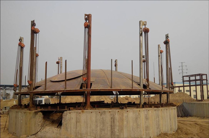 在焊接油罐的第一步就是需要對油罐的整體重量有正確的計算,一般選定電動葫蘆的總額定重量為油罐整體重量的1.3-1.5倍以上。確定焊灌電動葫蘆臺數后,要精確計算和確定吊點的間距,個各吊點間距一定要相等且均衡布點。由于施工工藝上要求少開天窗,因此首先吊點要盡可能少,除要求首次吊點的間距一致外,還要考慮以后吊點的均衡設置,以保持各吊點的間距相等,盡可能為電動葫蘆的均載運行創(chuàng)造條件。根據以往的施工經驗,首次吊點一般為選定電動葫蘆總臺數的一半,第二次吊裝施工完畢后,即在吊裝第三層前要及時補進其余所有吊點立柱,掛上整套焊灌電動葫蘆,全部投入第三層的吊裝運行。
