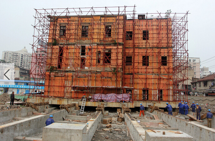 據(jù)了解,建筑物年代久遠(yuǎn),為了保證移動時(shí)不散架,必須要求基礎(chǔ)的加固工程做得更細(xì)致。水泥托盤是在房屋地基被掏空后,用液壓千斤頂將小樓抬高1.4米,用鋼筋混凝土澆筑而成。這樣,平移時(shí)的受力點(diǎn)也都在“托盤”上,而不在樓體建筑上。經(jīng)過反復(fù)推算,后將平移速度設(shè)置在每小時(shí)70厘米。