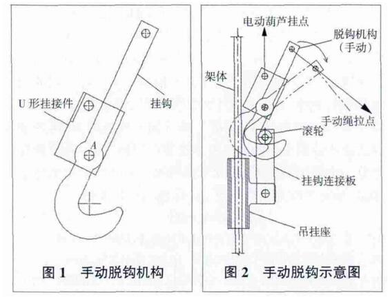手動(dòng)脫鉤工作原理。如圖2所示,掛鉤通過滾輪把架體鉤住,電動(dòng)葫蘆通過U形連接件連接,把架體吊掛在附著處,當(dāng)掛鉤被人用繩索拉動(dòng)并繞A點(diǎn)轉(zhuǎn)動(dòng)時(shí),掛鉤下部圓弧逐步速脫開滾輪,脫開后架體失去支承而墜落。