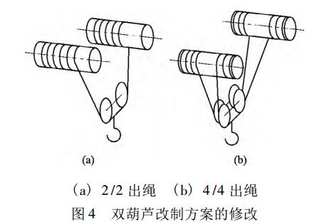 可知,當鋼絲繩直徑和滑輪直徑確定后,鋼絲繩之間距離越大,能夠正常起升的大高度越高。這樣,可通過在吊鉤組水平方向增加滑輪的方式增大L值,來避免鋼絲繩纏絞的現(xiàn)象。雙葫蘆改制方案中的2 /2和4 /4出繩方案可變?yōu)閳D4所示的結(jié)構(gòu)。