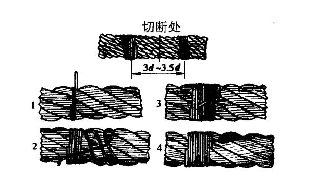 鋼絲繩作為鋼絲繩電動(dòng)葫蘆的重要配件,那么鋼絲繩的切割和炸結(jié)也是重要的技術(shù)知識(shí),接下來我們就要做一個(gè)具體的介紹:切斷鋼絲繩,可借助于特制鍘刀、鋼鋸或氧炔氣割均可。但為防止切斷時(shí)鋼繩各股與鋼絲的松動(dòng),須在切斷前,先在切割的兩邊用鋼絲扎結(jié)牢靠。扎結(jié)位置和順序見下圖