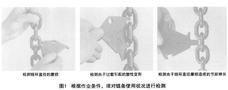 (3)檢查鏈環(huán)磨損及伸長(zhǎng):用生產(chǎn)廠商提供的標(biāo)牌進(jìn)行簡(jiǎn)單檢測(cè) (見(jiàn)圖1 ) 。
