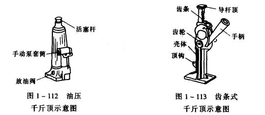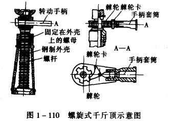 棘輪手柄由棘輪、棘輪卡、手柄套筒組成。還有一種傘齒輪式螺旋千斤頂,如圖1-111所示。扳動(dòng)操作手柄,經(jīng)過(guò)傘形齒輪傳動(dòng),將千斤頂升起,這種千斤頂上還裝有一個(gè)換向扳鈕,可控制千斤頂?shù)纳蛯?。螺旋前幾單均有自鎖作用,所以重物不會(huì)因停止操作而突然下降,也無(wú)漏油等故障問(wèn)題,維護(hù)保養(yǎng)也較方便,能在垂直、橫臥或倒放等幾種位置狀況下使用。使用的有5、10、15、30、50t等規(guī)格。手柄操作力有十多公斤到幾十公斤不等,由1-3人操作。