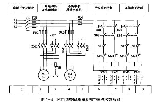 MD1型鋼絲繩電動葫蘆是一種輕小型起重設(shè)備。它可以飯莊在葫蘆單梁、橋式起重機、門式起重機、懸掛起重機等機械上,實現(xiàn)精密裝卸、砂箱合模、機床檢修等精細作業(yè)。MD1型鋼絲繩電動葫蘆電氣控制線路如圖9-4所示。
