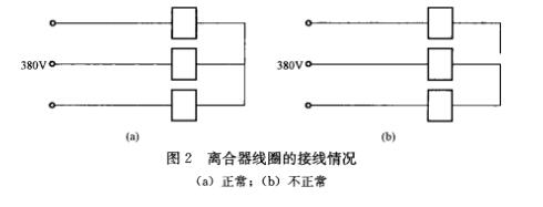 從圖2(a)可以看出,正常的情況下,3個線圈的電壓都是220V,3個線圈都能正常地吸合,離合器也能正常的離合,上升和下降時電動機能正常地工作,但在有一個線圈的一端脫離中點后,中點就不存在了,見圖2(b)。3個線圈中,一個線圈沒有電壓,另兩個線圈的電壓為380/2V=190V,每個線圈雖說有190V,但這兩個線圈是串聯(lián)的,不能保證兩個線圈的阻抗是相等的,這時3個線圈都不可能正常地工作,造成了離合器不能正常地勤離合。離合器的工作不正常,就造成了電動葫蘆上升和下降時的阻力增大,電動機就不能正常的工作工作,電動葫蘆就不可能正常的上升和下降了。