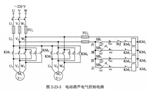 如圖2-23-3所示為電動葫蘆電氣控制電路圖。提升電動機M1由上升、下降接觸器KM1、KM2控制,移動電動機M2由向前、向后接觸器KM3、KM4控制。它們都由電動葫蘆懸掛按鈕站上復式按鈕SB1-SB4實現(xiàn)電動控制,SQ為提升行程開關(guān)。