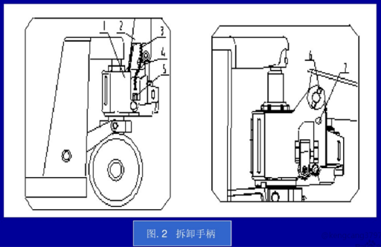 完全拆卸手柄:手柄的拆除方法如圖2:將鏈條3的端部從杠桿板5的槽內(nèi)取出來(lái)。把鏈條3從軸4的中間孔內(nèi)抽出來(lái)。將手柄扳約80°,往孔7內(nèi)插入螺絲刀。用工具榔頭和沖頭拆下彈性銷6,并把軸4拆下來(lái),然后取下手柄。
