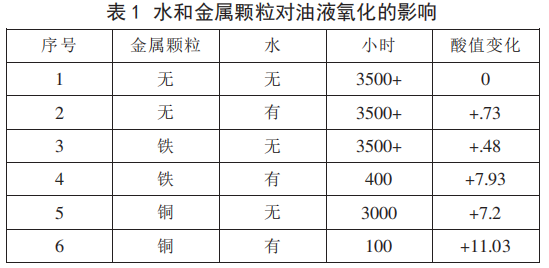 3、加速液壓油性能劣化。固體顆粒尤其是金屬顆粒,還起著催化劑作用,能加速油液氧化,導(dǎo)致其性能下降,如表1所示,為水和金屬顆粒對液壓油氧化影響實(shí)驗(yàn)的數(shù)據(jù),實(shí)驗(yàn)研究表明,金屬顆粒和水的同時存在可以家具油液的氧化速度,鐵和銅的催化作用可以使油液的氧化速度分別增加10和30倍以上。
