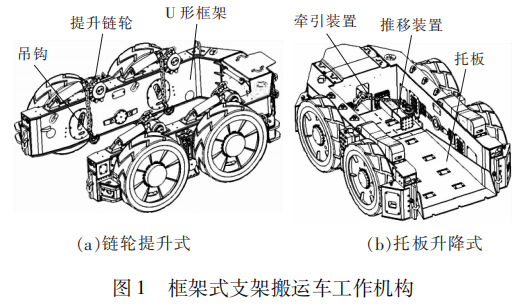 框架式支架搬運(yùn)車主要用來拖運(yùn)支架,如圖1所示,其工作機(jī)構(gòu)是基于U形框架的鏈輪提升式(或托板升降式)支架裝載機(jī)構(gòu)。鏈輪提升式機(jī)構(gòu)是利用4 個吊鉤鉤住支架起吊環(huán),通過操作提升鏈輪動作實(shí)現(xiàn)支架的提升裝載。倘若U形框架內(nèi)寬設(shè)計較窄,待支架進(jìn)入框架時,支架兩側(cè)剩余空間較小,增加了工人的掛鉤難度,影響了支架的裝卸速度;另外,倘若提升鏈輪的離地高度設(shè)計較高,待支架進(jìn)入框架時,壞損支架的側(cè)護(hù)板處于張開狀態(tài),張開的側(cè)護(hù)板極易與提升鏈輪發(fā)生碰撞,阻礙支架進(jìn)入框架,同樣影響了支架的裝載速度。托板升降式機(jī)構(gòu)的裝卸架原理是在裝架時落下托板,利用牽引裝置將支架牽引至框架內(nèi),卸架時利用推移裝置將支架推出框架,以此實(shí)現(xiàn)支架的裝卸。倘若在使用過程中,托板滾輪卡滯,加之牽引裝置繩力設(shè)計有限,則會導(dǎo)致裝架困難;倘若推移裝置推出時,其導(dǎo)向套筒發(fā)生變形別卡,則會導(dǎo)致卸架困難,進(jìn)而影響了支架搬運(yùn)車的作業(yè)效率。