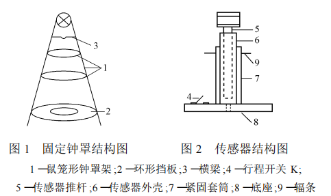 傳感器外殼固定在套筒上,底座則與套筒固定在一起、三者連為一體。設(shè)置環(huán)形擋板和輻條是因?yàn)樵陔妱?dòng)葫蘆制動(dòng)后,底座和重物砣由于受到自身重力的作用,必然要下滑一段距離,當(dāng)?shù)鬃禄絺鞲衅魍茥U端部時(shí),輻條碰住環(huán)形擋板上表面,底座停止下滑,這樣可避免將推桿從傳感器外殼中拉出。同時(shí),環(huán)形擋板還起著在底座上升時(shí)閉合行程開關(guān)的作用。因此,環(huán)形擋板和輻條的安放位置十分關(guān)鍵。環(huán)形擋板的位置應(yīng)保證在測(cè)試過程中重物饦推動(dòng)底座上升到行程開關(guān)碰住環(huán)形擋板底部時(shí),傳感器端部與底座之間仍有一微小距離,這樣就防止了底座撞擊傳感器端部而損壞傳感器。輻條的位置應(yīng)保證底座下滑到碰到環(huán)形擋板時(shí),推桿剛好到達(dá)傳感器大位置且未從外殼中拉出。