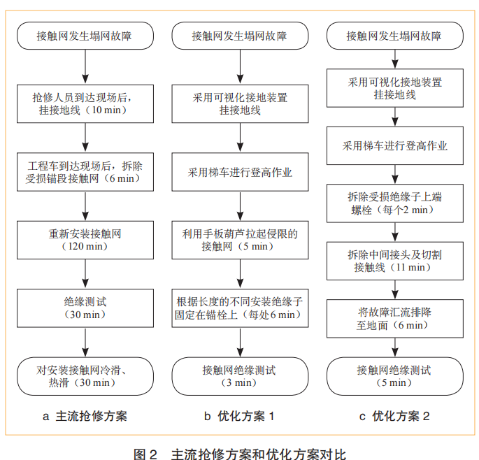 對(duì)比主流搶修方案和優(yōu)化后的2種不同的方案,如圖2所示。方案1:假設(shè)發(fā)生接觸網(wǎng)塌網(wǎng)故障,定位化學(xué)錨栓未脫落時(shí),接觸網(wǎng)未斷裂,將侵限的接觸網(wǎng)利用手扳葫蘆拉起。再次固定到懸掛定位上,保證不侵入車輛限界;方案2:接觸網(wǎng)塌網(wǎng)故障造成接觸網(wǎng)斷裂,將故障變形的接觸網(wǎng)進(jìn)行切除。