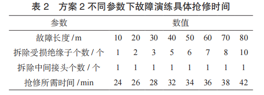根據(jù)接觸網(wǎng)受損長(zhǎng)度的不同,處理的時(shí)長(zhǎng)也不同,方案2故障演練具體搶修時(shí)間見表2,將該段接觸網(wǎng)拆除后經(jīng)判斷具備送電條件后電調(diào)送電,車輛在通過該區(qū)域時(shí),必須降弓通過,否則會(huì)造成二次故障。