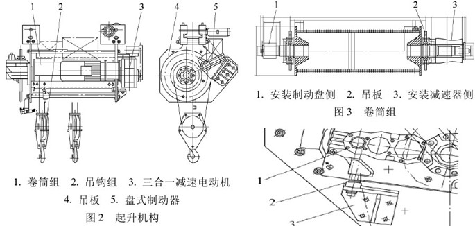 起升機構(gòu)采用三合一減速電動機,通過花鍵軸驅(qū)動卷筒組,卷筒組上設(shè)有電磁盤式安全制動器,用于保證在起升機構(gòu)故障時閘住卷筒,保證載荷不墜落。結(jié)構(gòu)上用2吊板將卷筒組吊掛起來,減速器力矩支撐、制動器、安全保護裝置等均安裝在吊板上。起升機構(gòu)見圖2。