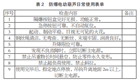 電纜滑車的滾輪材料:防爆電動葫蘆電纜滑車的滾輪使用工程塑料材料,避免因摩擦產(chǎn)生火花。防爆電動葫蘆使用:按照防爆電動葫蘆日常使用表單(見表 2)進行檢查和使用,確保了安全生產(chǎn)。