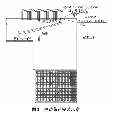 在抽水蓄能電站地下廠房土建及機電設備安裝施工過程中,因施工場地空間受限,導致材料垂直運輸通道單一影響現(xiàn)場施工進度。為解決此類問題,利用電動葫蘆具有體積小、自重輕、操作簡單、使用方便等特點,采用在副廠房頂拱巖體位置安裝電動葫蘆、副廠房各樓層預留吊物孔的方式,形成副廠房臨時垂直運輸通道,滿足土建施工期模板、腳手架。機電設備安裝期空壓機氣罐、電氣盤柜等材料設備的轉運,有效利用現(xiàn)場施工空間。從而達到提升施工效率、降低現(xiàn)場施工強度及節(jié)約施工成本的目的。
