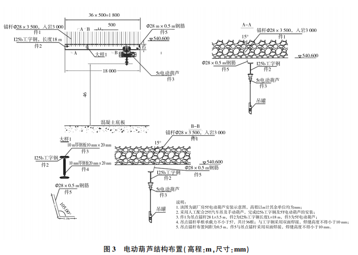 吊點錨桿施工:在通風機房樁號CZO-122.00右6m至主廠房副廠房廠左12m段洞頂供高程540.600m位置布設一根125b工字鋼長度18m 。5t電動葫蘆通過125b