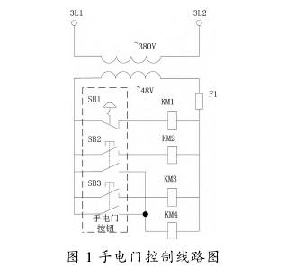 手電門(mén)控制電動(dòng)葫蘆的控制器線(xiàn)路圖如圖1所示,急停開(kāi)關(guān) SB1 拔起后接觸器 KM1 得電,電動(dòng)葫蘆動(dòng)力電上電,SB2 和 SB3 為雙擋按鈕,通過(guò)操作按鈕控制電動(dòng)葫蘆以低速或高速進(jìn)行上升或者下降運(yùn)行,手電門(mén)通過(guò)移動(dòng)電纜和牽引繩懸掛在葫蘆下方隨葫蘆水平方向一起運(yùn)行。