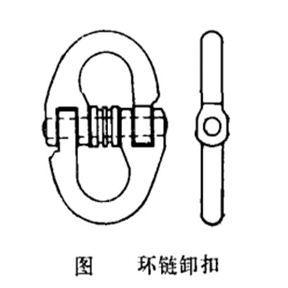 圖中a是U型帶鎖緊螺母卸扣,適于在高處或不易發(fā)現(xiàn)其松脫處使用;b為馬蹄形卸扣,具有較大的環(huán)腔;c是帶滾輪卸扣;d是長(zhǎng)環(huán)腔卸扣,適合于不同的使用條件。國(guó)外還應(yīng)用一種適合于鏈條作業(yè)用的卸扣,下圖是瑞典公司生產(chǎn)的鏈環(huán)卸扣,用它可以靈活地調(diào)整鏈條索具的分支或更換夾具。