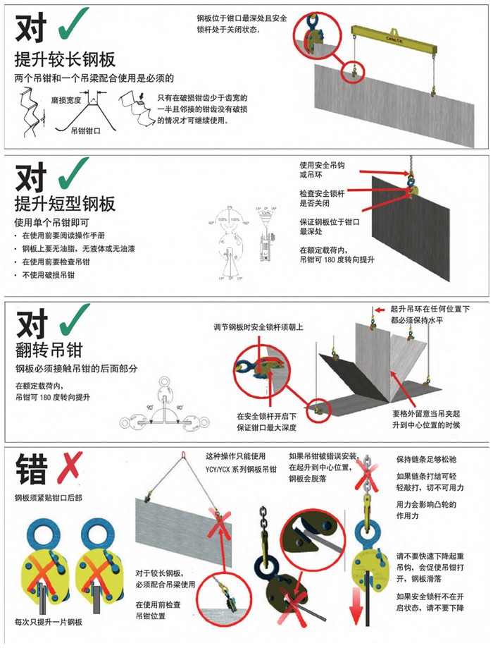 CDH型豎吊起重鉗適用于鋼板豎直吊裝,此種鋼板吊鉗采用首鋼低碳優(yōu)質(zhì)合金鋼制造,載荷范圍為0-10噸。它只能同時(shí)吊裝一塊鋼板,嚴(yán)禁層疊吊裝。吊鉗起 吊時(shí)必須將拉環(huán)手柄向上,以使彈簧拉緊,卸荷時(shí)拉環(huán)手柄向下,彈簧放松后簽字和鋼板才能分離,且吊裝過程中不得碰撞被吊物,嚴(yán)禁超載使用。帶彈簧鎖無作業(yè) 狀態(tài)下,鎖具自然加緊,吊上物體夾力成比例增強(qiáng)。本產(chǎn)品嚴(yán)格按國家3包執(zhí)行,產(chǎn)品質(zhì)量由中國人民保險(xiǎn)公司(PICC)承保,請(qǐng)放心使用。